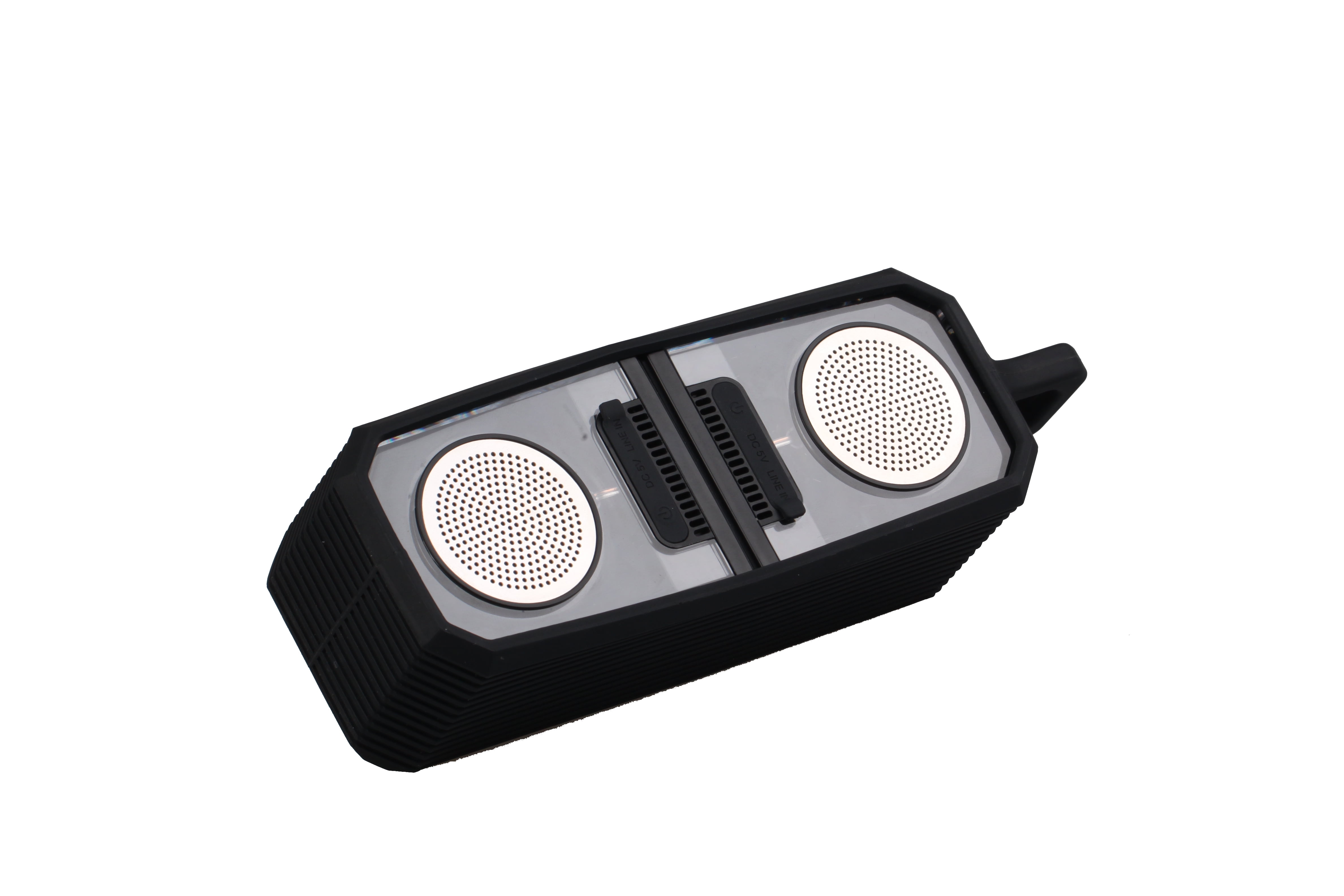 Dimensions. 2 X 6.5 " SPEAKERS. BLUETOOTH - ENABLES SIMPLE WIRELESS PAIRING WITH YOUR BLUETOOTH-ENABLED DEVICES. LIGHT-UP DESIGN. BUILT-IN RADIO FM. AUX INPUT. 6.5MM MICROPHONE INPUT. BUILT-IN RECHARGEABLE BATTERY. IMPEDANCE: 2Ω.